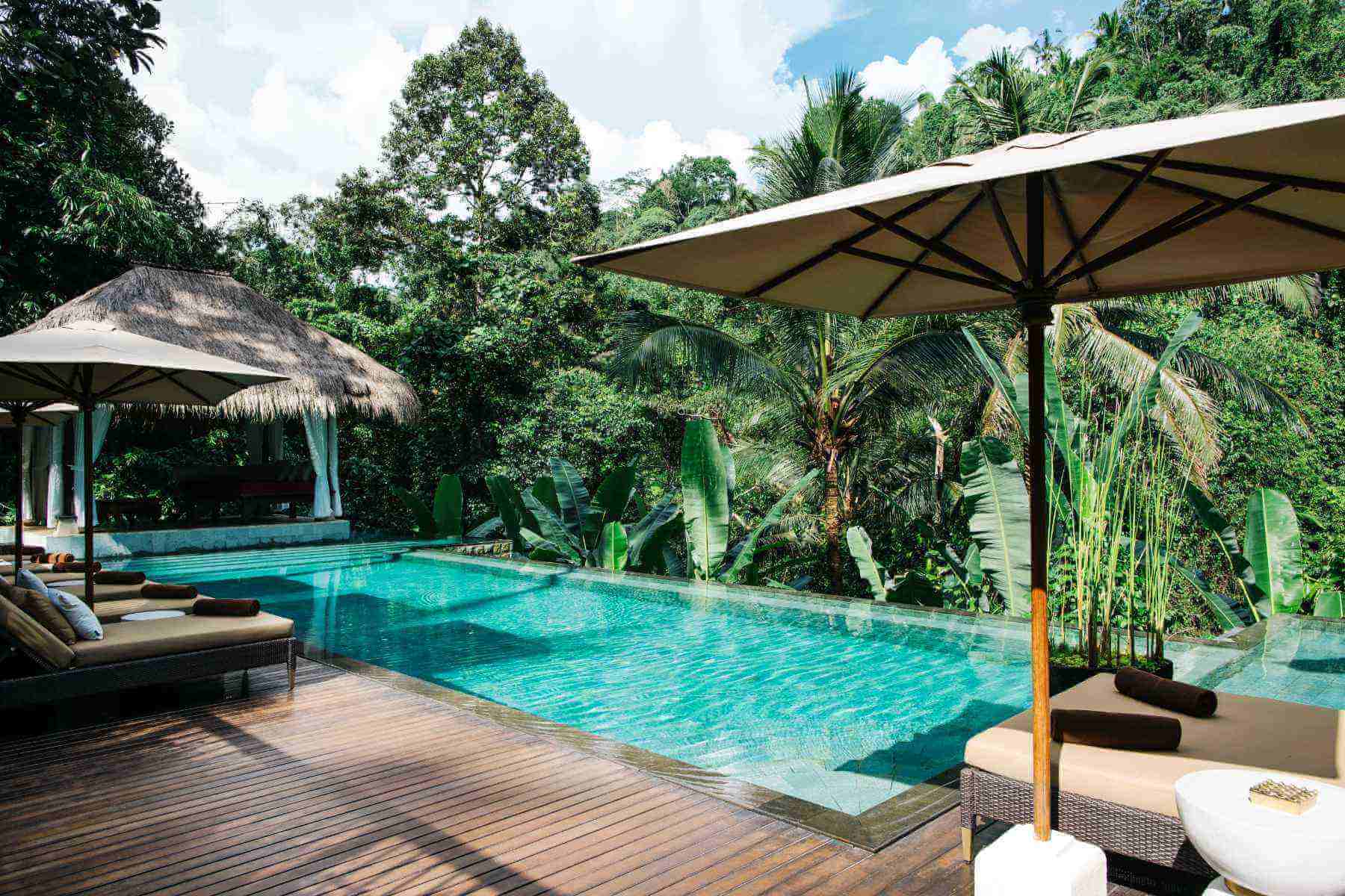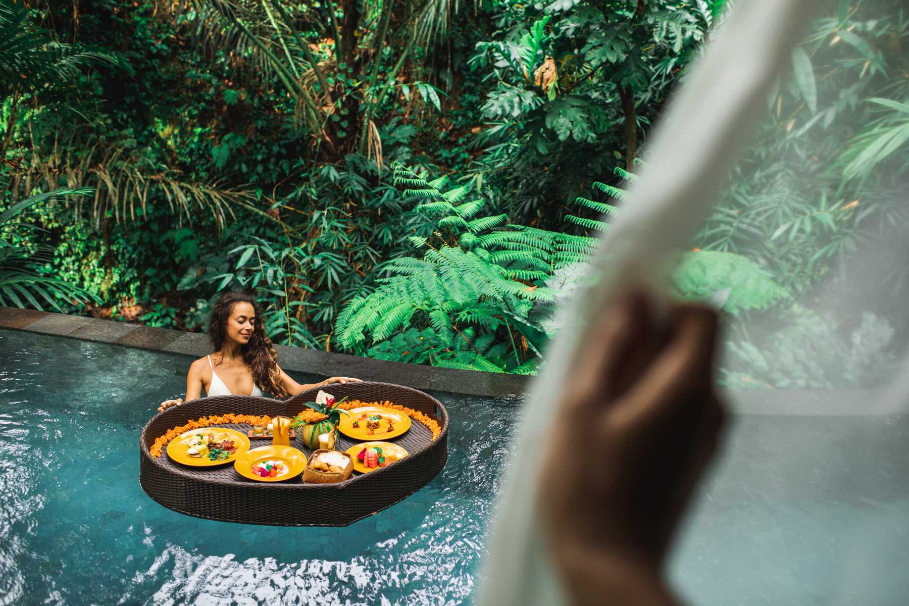 Escape to an elevated villa surrounded by tropical jungle, wooden interiors, and a private open-air rain shower.